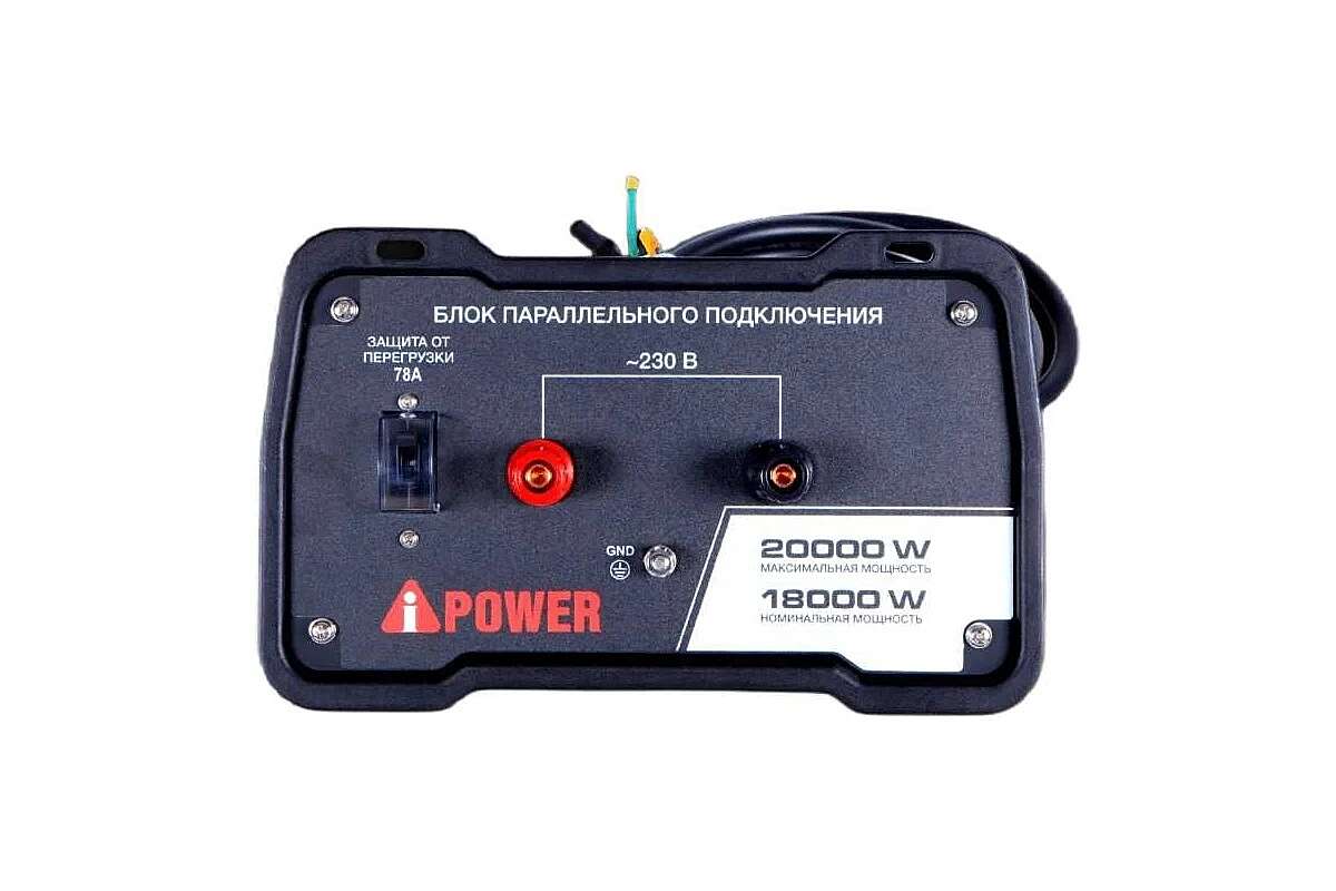 Блок параллельной работы для инверторного генератора A8000iS A-iPower 29104 позволяет объединить мощности 2 инверторных генераторов и получить исходящую мощность равной сумме мощностей двух объединенных генераторов. На устройстве расположены клеммы снятия полной мощности и автомат защиты. Предназначен для инверторных генераторов с номинальной мощностью от 7000 Вт A-iPower. Данная модель подходит для инверторного генератора A-iPower A8000iS. В комплекте идёт устройство, соединительные провода и подробная инструкция по подключению.