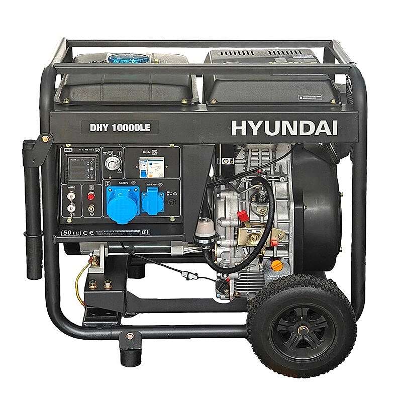 Модель дизельного генератора HYUNDAI DHY 10000LE запускается как вручную, так и электростартером, на выходе розетки 220 В 16 и 32 А, есть выход на 12 В, цифровой дисплей с отображением моточасов, напряжения и силы тока. Для удобства перемещения есть колеса.